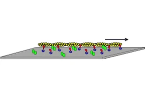 A key assay for determining changes in power output due to HCM and DCM mutations is the loaded in vitro motility assay. The yellow actin filament is being driven in the direction of the arrow by the red myosin heads that are attached to the surface by the blue anchor molecules. The green actin-binding proteins serve as a load on the actin.